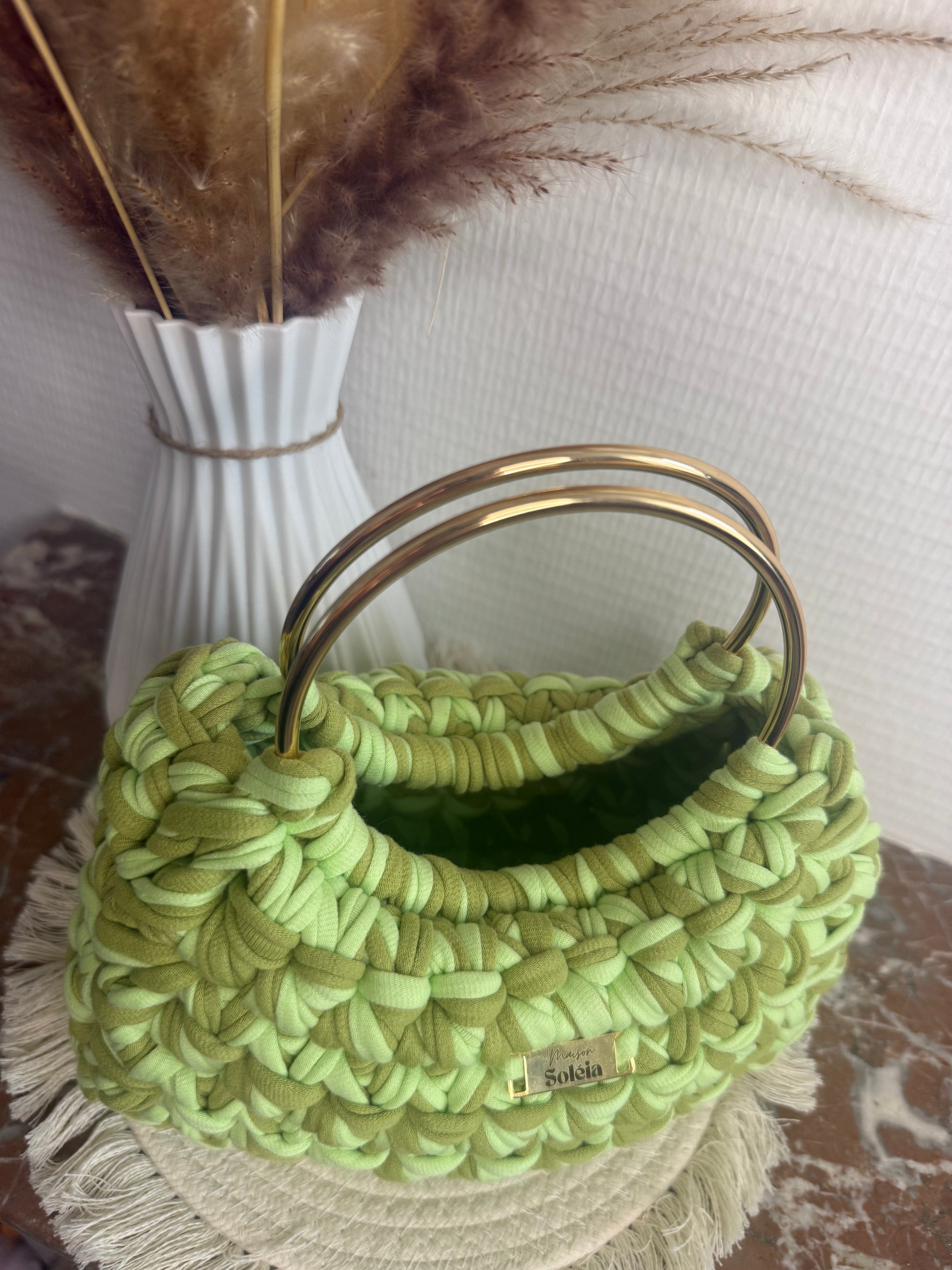 Crocheté à la main en France, ce modèle joue sur un mélange de deux verts printaniers pour un look frais et sophistiqué, idéal pour vos sorties et cérémonies.